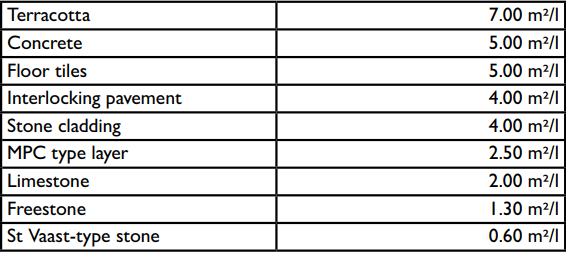 Coverage depends on the porosity of the material. The figures below should be used only as a general guideline: