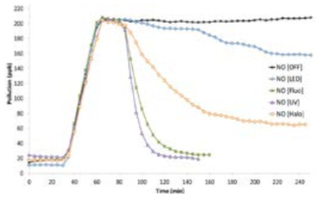 Polluted gas containing up to 220 ppb of NO is injected in the reactor. Light is then switched on. Several lights aretested: fluo UV, fluo visible, halogen, LED. Pollution is calculated at the exit of the reactor thanks to an analyzer. The efficiency of the product is characterized by the reduction of NO. The following results are observed: