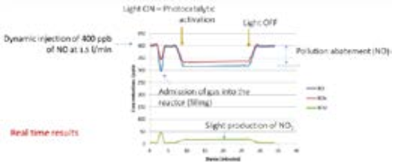 Polluted gas containing up to 400 ppb of NO is injected in the reactor. Light is then switched on. Several lights are tested: fluo UV, fluo visible, halogen, LED with different intensities. Pollution is calculated at the exit of the reactor thanks to an analyzer which detects residual NO, NO2 produced and NOX. The efficiency of the product is characterized by the reduction of NO. Decrease from 38% to 72% can be observed.