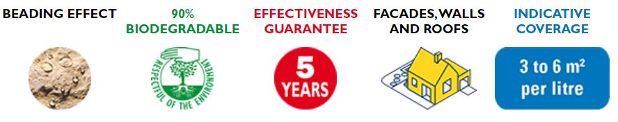 ImperGuard® is a high performance water-repellent product for protecting porous walls, facades and roofs from humidity. ImperGuard® penetrates deeply into the pores of the material to make it impermeable and so prevent the harmful effects of humidity: infiltrations, acid rain, erosion, freeze/thaw cycle, moss and lichen growth, efflorescence, saltpetre, etc.