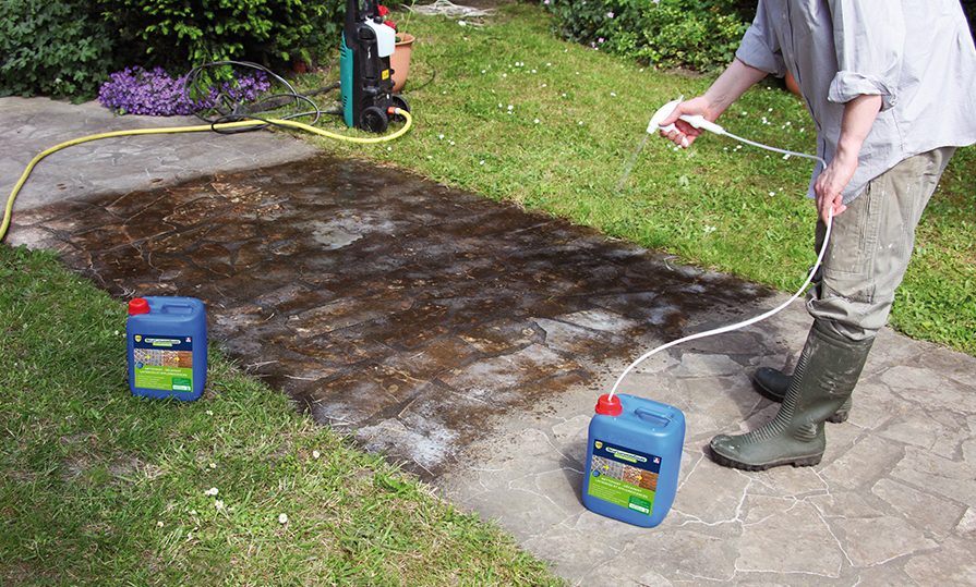 After applying the cleaning products, make sure you rinse your patio thoroughly. Beware! Using a high-pressure sprayer with its powerful jet damages and weakens the surface of your patio. This encourages the growth of lichens over time and allows dirt to penetrate more easily. Always rinse using a low-pressure sprayer or jet.